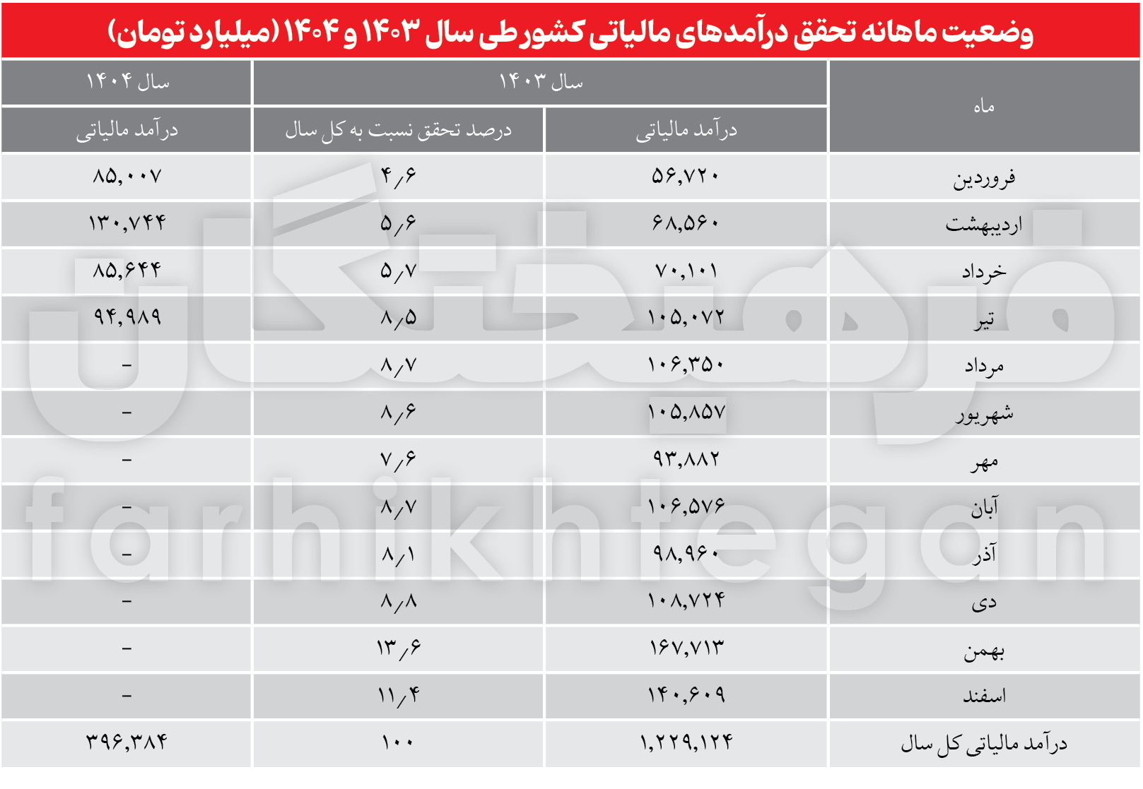 براساس دادههای سازمان امور مالیاتی، در 4 ماهه نخست امسال رقم درآمدهای مالیاتی تحت تکالیف این سازمان (به جز مالیات بر واردات که جزء تکالیف گمرک ایران است)، به 396 هزار و 384 میلیارد تومان رسیده که در مقایسه با رقم 300 هزار میلیارد تومانی 4 ماهه نخست سال 1403 رشد نزدیک به 32 درصدی داشته است.
