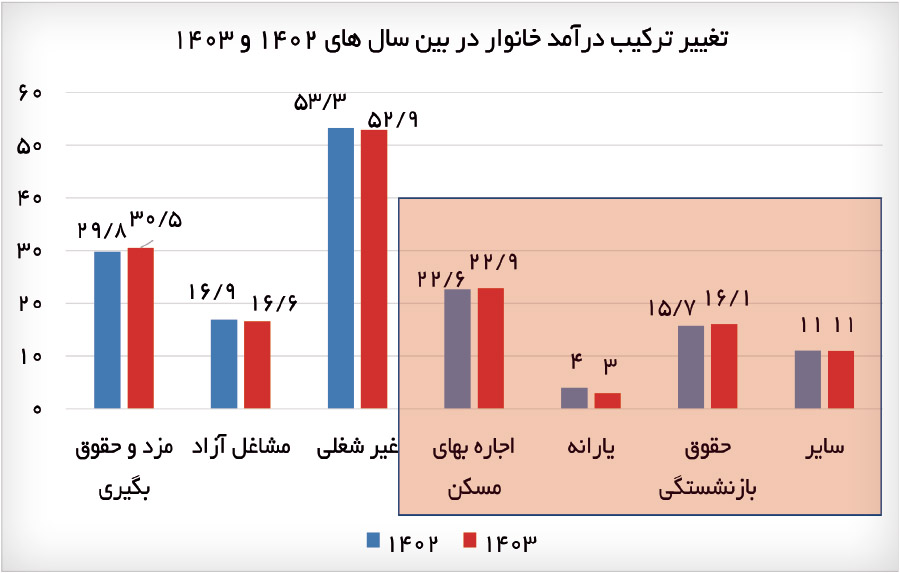 جزئیات دیگری از درآمد خانوارهای شهری نیز نکات مثبت و منفی دارد. سهم درآمدهای غیرشغلی از کل درآمد خانوار در سال ۱۴۰۳ کاهش یافته و از ۵۳.۳ درصد به ۵۲.۹ درصد رسیده است؛ نشانه‌ای از اتکا کمتر به درآمدهای غیرمولد. همزمان، کاهش درآمدهای مشاغل آزاد موجب شد سهم درآمدهای مزد و حقوق‌بگیری افزایش یابد. در بین درآمدهای غیرشغلی، سهم اجاره‌بهای مسکن رشد کرده است، نشان‌دهنده آن که همچنان این بخش یکی از نقاط اتکای خانوارها در دوران رشد اقتصادی پایین و کاهش درآمد مشاغل است.
