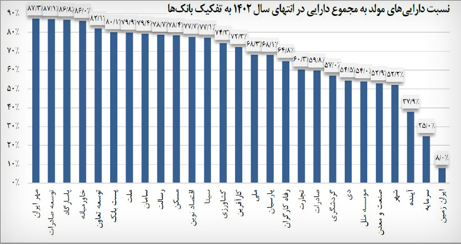 دارایی های مولد: نسبت دارایی های مولد به کل دارایی های بانک نشان دهنده این است که چه میزان از منابع مالی بانک ها به دارایی هایی اختصاص پیدا کرده که درآمدزایی مناسبی دارند. دارایی های مولد عبارت اند از سرمایه گذاری در سهام با قدرت نقدشوندگی بالا و اوراق بدهی، مطالبات از بانک ها موسسات اعتباری و موجودی نقد. در این زمینه، داده های سال ۱۴۰۲ حاکی از این است که بانک های مهر ایران، توسعه صادرات، پاسارگاد، خاورمیانه دارای بیشترین نسبت دارایی های مولد بوده اند.