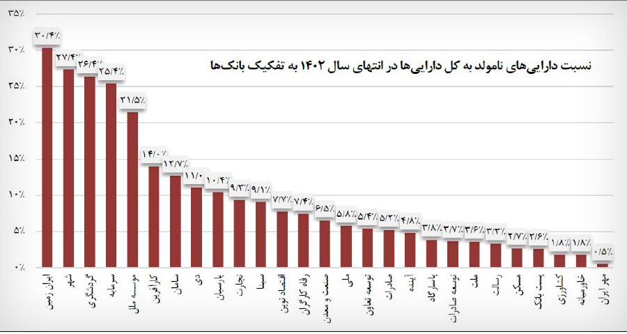 تسهیلات معوق: در سال ۱۴۰۲، این نسبت افزایش یافته و به حدود ۱۳ درصد رسیده است. ۷ بانک آینده، سرمایه، صنعت و معدن، دی، پارسیان، شهر و صادرات دارای نسبت تسهیلات غیرجاری بیشتری در مقایسه با میانگین شبکه بانکی بوده اند.