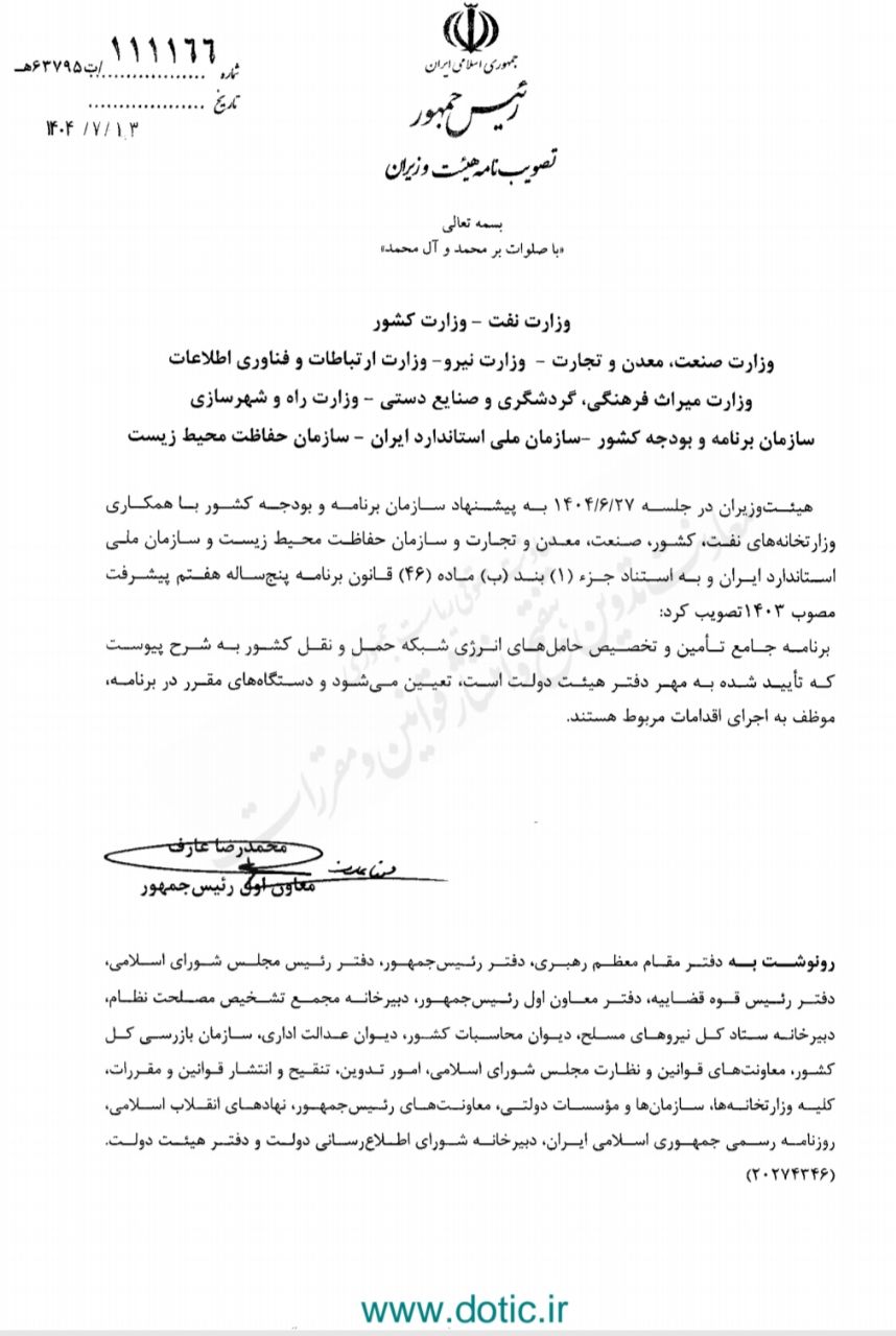 تصویبنامه مصوب جلسه مورخ ۱۴۰۴/۰۶/۲۷ هیات وزیران درخصوص «تعیین برنامه جامع تامین و تخصیص حامل های انرژی شبکه حمل و نقل کشور» با شماره ۱۱۱۱۶۶ در تاریخ ۱۴۰۴/۰۷/۱۳ توسط معاون اول رییس جمهور ابلاغ شد. متن این تصویبنامه را از اینجا بخوانید.