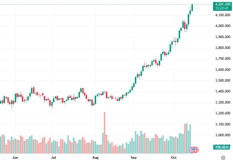 قیمت هر اونس طلا امروز با 53 دلار افزایش به 4200 دلار رسید. قیمت معاملات آتی طلا در بازار کامکس نیویورک هم با یک افزایش 1.27 درصدی به 4217 دلار و 70 سنت رسیده است.