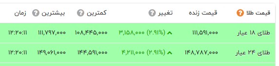 در بازار نرخ هر گرم طلای 18 عیار با 315 هزار تومان افزایش و با نرخ 11 میلیون و 159 هزار تومان در بازار طلا معامله شد. سکه امامی با 2 میلیون و 220 هزار تومان افزایش به 114 میلیون و 510 هزار تومان قیمت گذاری شد. سکه بهار آزادی با 1 میلیون و 910 هزار تومان افزایش به 107 میلیون و 820 هزار تومان رسید. نرخ نیم سکه و ربع سکه به ترتیب 59 میلیون و 150 هزار تومان و 33 میلیون تومان در تابلو اعلان قیمتها نمایان شد.