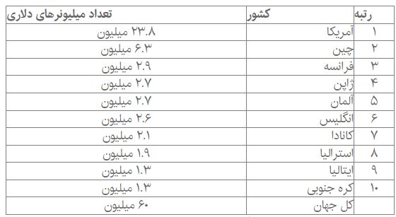 ایسنا/ آمریکا، چین و فرانسه، بزرگترین جمعیت میلیونرها را در خود جای دادهاند که در مجموع بیش از نیمی از کل جمعیت میلیونرهای جهان را تشکیل میدهند.
