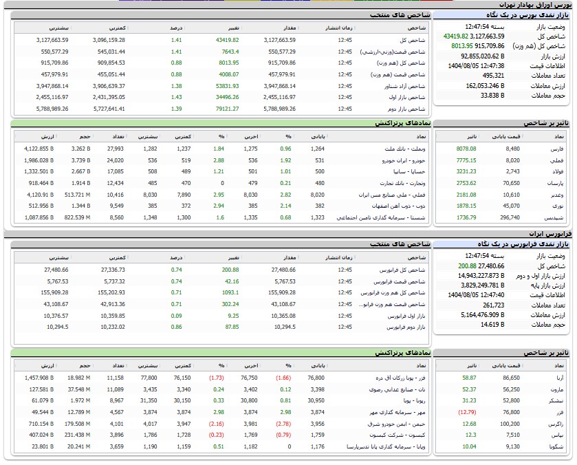 آخرین خبر/شاخص کل بورس با صعود ۴۳ هزار واحدی در پایان معاملات امروز به ۳ میلیون و ۱۲۷ هزار واحد رسید.
