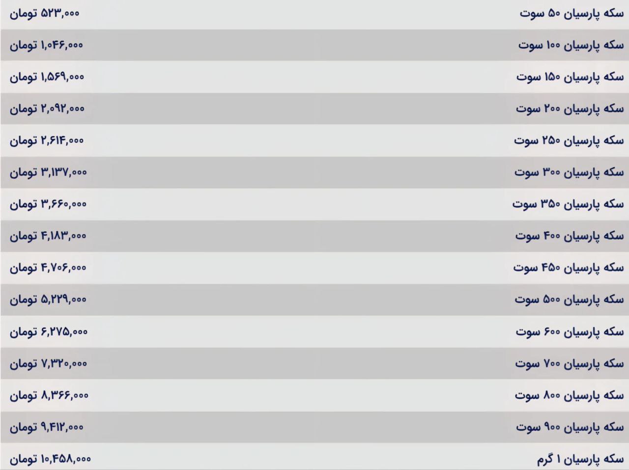 همچنین، قیمت سکه پارسیان ۵۰ سوت با رقم ۵۲۳ هزار تومان به ثبت رسید.