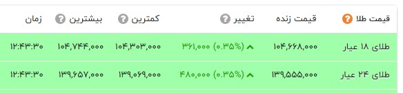 در بازار نرخ هر گرم طلای 18 عیار با 36 هزار تومان افزایش و با نرخ 10 میلیون و 466 هزار تومان در بازار طلا معامله شد. سکه امامی با 695 هزار تومان افزایش به 111 میلیون و 305 هزار تومان قیمت گذاری شد. سکه بهار آزادی با 420 هزار تومان افزایش به 104 میلیون و 160هزار تومان رسید. نرخ نیم سکه و ربع سکه به ترتیب 58 میلیون تومان و 33 میلیون و 300 هزار تومان در تابلو اعلان قیمت‌ها نمایان شد.
