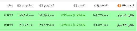 در بازار نرخ هر گرم طلای 18 عیار با 122 هزار تومان افزایش و با نرخ 10 میلیون و 577 هزار تومان در بازار طلا معامله شد. سکه امامی با 695 هزار تومان افزایش به 111 میلیون و 905 هزار تومان قیمت گذاری شد. سکه بهار آزادی با 1.160هزار تومان افزایش به 104 میلیون و 990 هزار تومان رسید. نرخ نیم سکه و ربع سکه به ترتیب 58 میلیون و 500 هزار تومان و 33 میلیون و 660 هزار تومان در تابلو اعلان قیمتها نمایان شد.