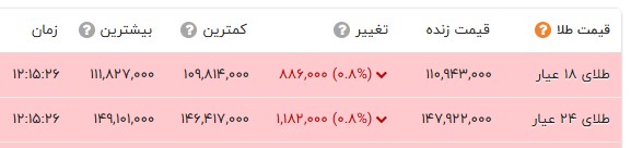 در بازار نرخ هر گرم طلای 18 عیار با 88 هزار تومان کاهش و با نرخ 11 میلیون و 518 هزار تومان در بازار طلا معامله شد. سکه امامی با 895 هزار تومان کاهش به 115 میلیون و 185 هزار تومان قیمت گذاری شد. سکه بهار آزادی با 415 هزار تومان کاهش به 109 میلیون و 520 تومان رسید. نرخ نیم سکه و ربع سکه به ترتیب 59 میلیون و 850 هزار تومان و 34 میلیون و 10 هزار تومان در تابلو اعلان قیمتها نمایان شد.