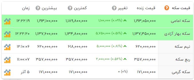 به گزارش آخرین خبر و تا لحظه تنظیم این خبر؛ سکه امامی با افزایش 110 هزار تومانی قیمت، 119 میلیون و 305 هزار تومان به فروش می رسد. نیم سکه با رشد 500 هزار تومانی قیمت، 62 میلیون تومان شد.