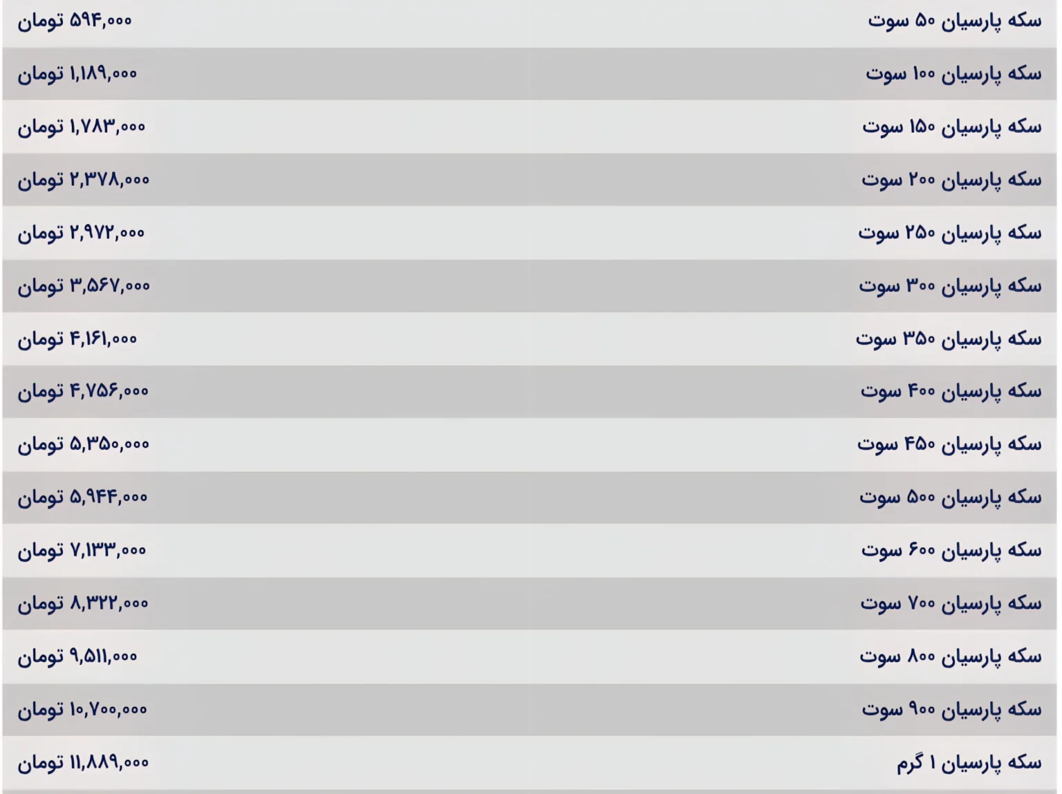 قیمت سکه پارسیان امروز یکشنبه ۹ آذر ۱۴۰۴ روی رقم ۱۱ میلیون و ۸۸۹ هزار تومان برای هر گرم قرار گرفت. همچنین، قیمت سکه پارسیان ۵۰ سوت با رقم ۵۹۴ هزار تومان به ثبت رسید.