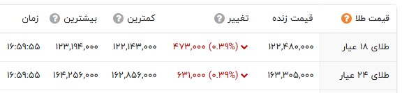 در بازار نرخ هر گرم طلای 18 عیار با 47 هزار تومان کاهش و با نرخ 12 میلیون و 248 هزار تومان در بازار طلا معامله شد. سکه امامی با 695 هزار تومان کاهش به 127 میلیون و 295 هزار تومان قیمت گذاری شد. سکه بهار آزادی با 545 هزار تومان کاهش به 121 میلیون و 370 تومان رسید. نرخ نیم سکه و ربع سکه به ترتیب 66 میلیون و 690 هزار تومان و 37 میلیون و 610 هزار تومان در تابلو اعلان قیمتها نمایان شد.