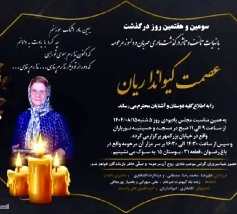 براساس اطلاع خانواده، به مناسبت سومین و هفتمین روز درگذشت آن بانوی گرانقدر، مراسم یادبودی روز شنبه ۱۵ آبانماه ۱۴۰۴ از ساعت ۹ تا ۱۱ صبح در مسجد و حسینیه نورباران واقع در خیابان بزرگمهر اصفهان برگزار خواهد شد. همچنین مراسمی دیگر به همین مناسبت از ساعت ۱۴:۳۰ تا ۱۶:۳۰ بر سر مزار آن مرحومه در باغ رضوان اصفهان، قطعه ۲۱، بوستان ۱۵ برگزار میشود.