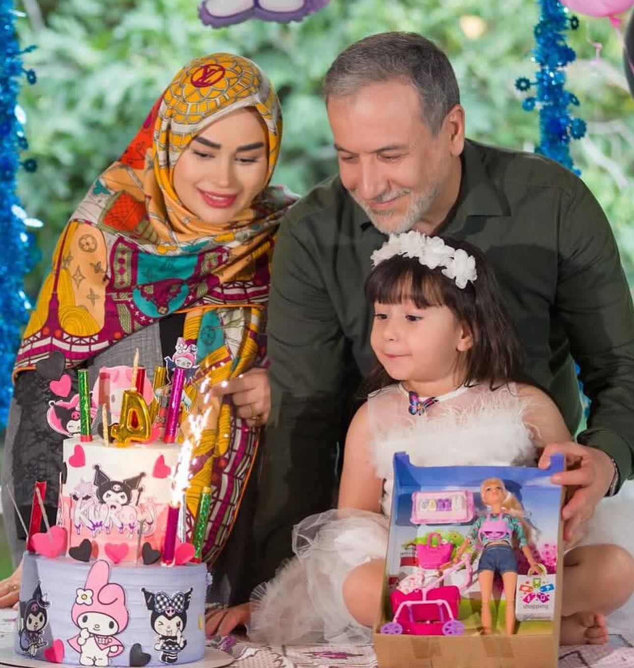 در این تصویر، کادوی عراقچی به دخترش یک عروسک باربی است و کیک تولد سوگل نیز با تم شخصیت کارتونی «کرومی» طراحی شده است.