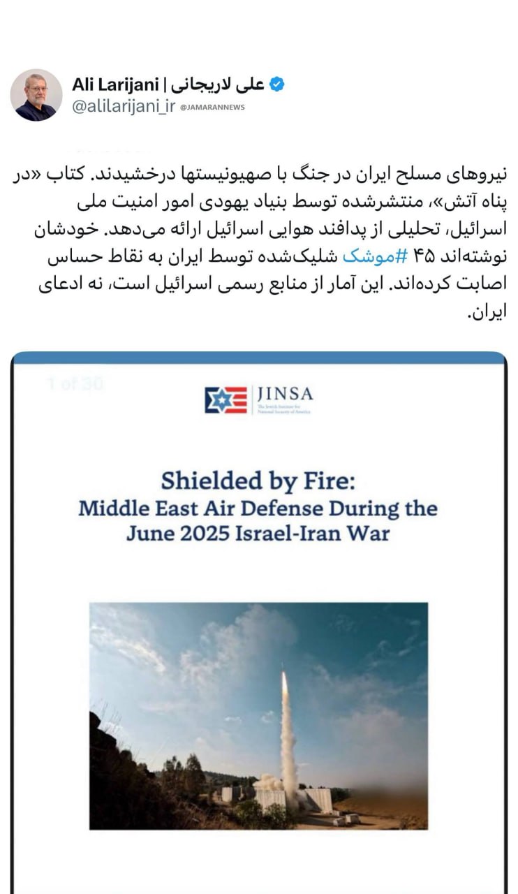 جماران/ دبیر شورای عالی امنیت ملی کشورمان نوشت: نیروهای مسلح ایران در جنگ با صهیونیستها درخشیدند. کتاب «در پناه آتش»، منتشرشده توسط بنیاد یهودی امور امنیت ملی اسرائیل، تحلیلی از پدافند هوایی اسرائیل ارائه میدهد. خودشان نوشتهاند ۴۵ موشک شلیکشده توسط ایران به نقاط حساس اصابت کردهاند. این آمار از منابع رسمی اسرائیل است، نه ادعای ایران.