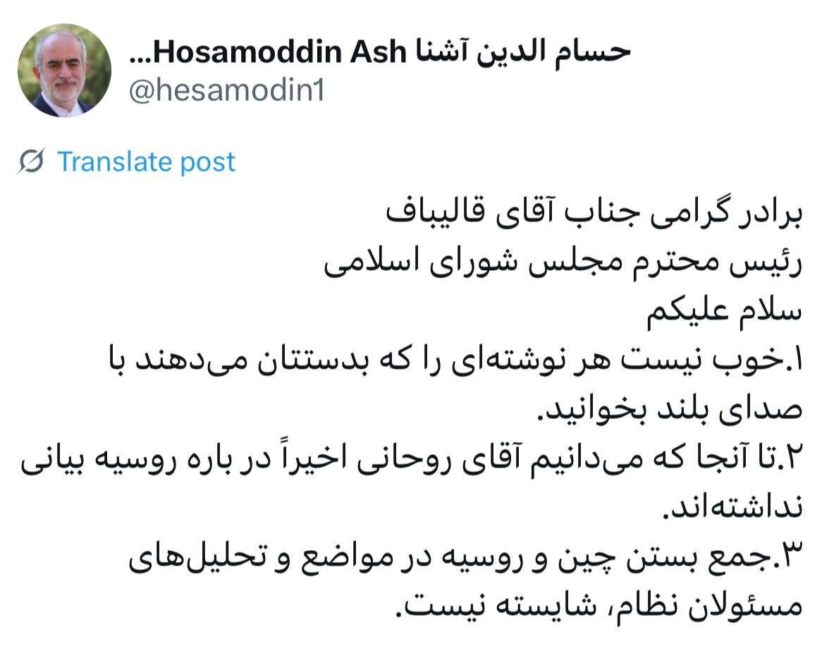 درپی اظهارات قالیباف در صحن علنی مجلس، حسام الدین آشنا مشاور سابق روحانی به اظهارات وی واکنش نشان داد و در توئیتی نوشت: