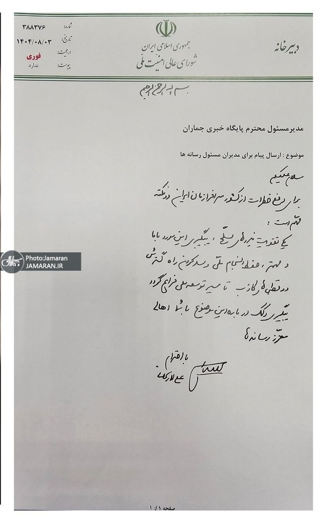 نامهای با دستخط علی لاریجانی، دبیر شورای عالی امنیت ملی، برای جماران ارسال شده و طبق اطلاع خبرنگار جماران، همین متن برای سایر رسانهها نیز ارسال شده است.