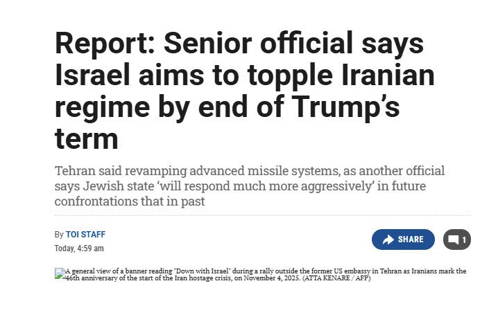 به گزارش وبگاه "تایمز اسرائیل"، یک مقام ارشد اسرائیلی که نامش فاش نشده به شبکه تلویزیونی "کان" اسرائیل گفت که هدف رژیم تل آویو سرنگونی نظام ایران تا پایان دوره ریاست جمهوری دونالد ترامپ، رئیس جمهور ایالات متحده، است. دولت ترامپ تا ژانویه 2029 در آمریکا بر سر کار است.