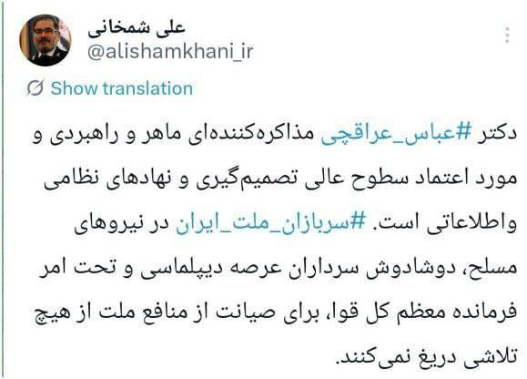 رویداد 24/ شمخانی که به تازگی به عنوان دبیر شورای دفاع از سوی رئیس جمهور تعیین شده است در پیامی از عراقچی تمجید کرد.