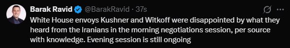 آخرین خبر/ باراک راوید، خبرنگار اسرائیلی آکسیوس مدعی شد: نمایندگان کاخ سفید، کوشنر و ویتکاف، از آنچه در جلسه مذاکرات صبح از ایرانیها شنیدند ناامید شدند، طبق گفته منبع مطلع. جلسه عصر هنوز در جریان است