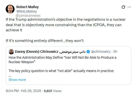 جماران/ رابرت مالی نماینده ویژه امور ایران در دولت بایدن می گوید: اگر هدف دولت ترامپ در مذاکرات، یک توافق هستهای باشد که از نظر واقعی محدودکنندهتر از برجام باشد، میتوانند به آن دست یابند. اگر هدف چیز کاملاً متفاوتی باشد، موفق نخواهند شد.