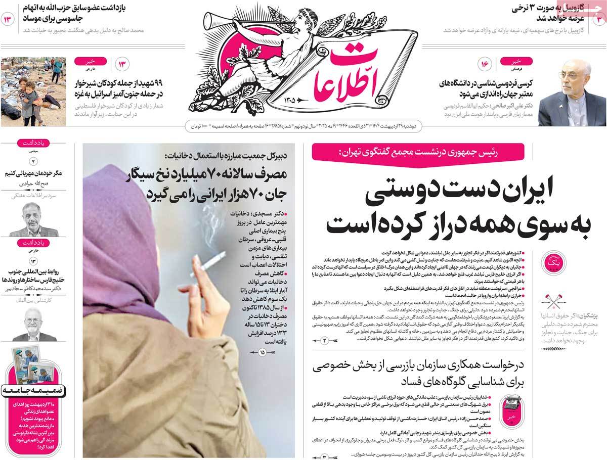 صفحه اول روزنامه اطلاعات دوشنبه ۲۹ اردیبهشت
