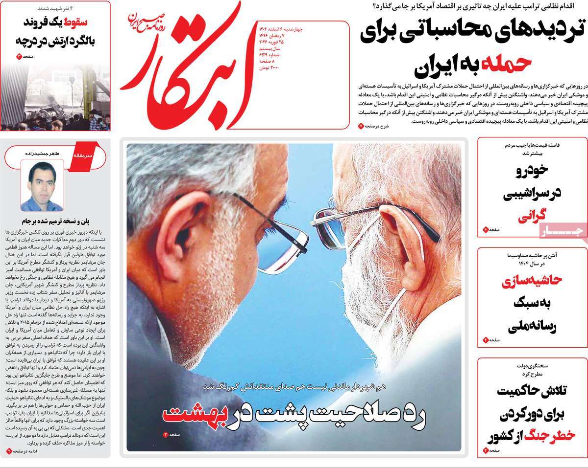 صفحه اول روزنامه ابتکار چهارشنبه ۶ اسفند