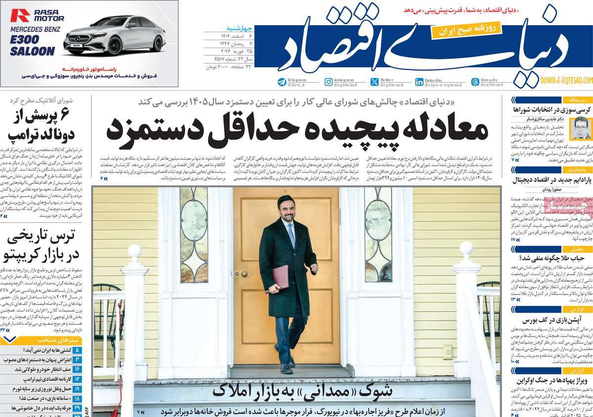 صفحه اول روزنامه دنیای اقتصاد چهارشنبه ۶ اسفند