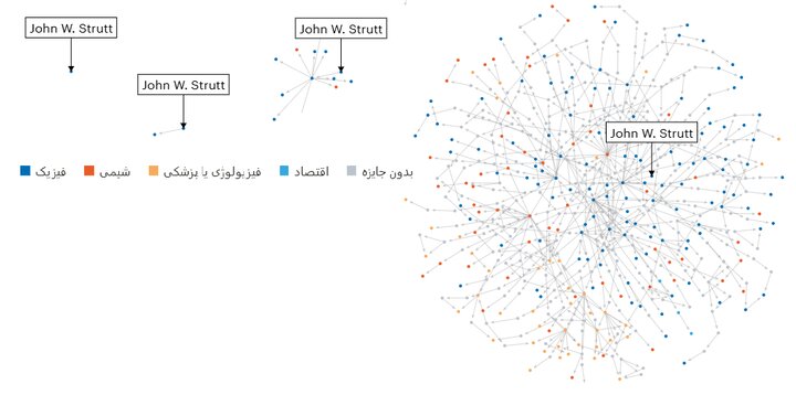 بیایید با مثالی از یک شبکه پربار در شجرهنامه بزرگتر نوبل شروع کنیم. جان دبلیو. استرات که در سال ۱۹۰۴ به خاطر کارش روی خواص گازها جایزه فیزیک را دریافت کرد، ۲۲۸ نفر از نوادگان دانشگاثببهیاش یعنی شاگردان خودش، شاگردان آنها و غیره، برنده جایزه نوبل شدهاند. گاهی اوقات بین برندگان جایزه فاصله وجود دارد، اما آنها همچنان با هم در ارتباط هستند.