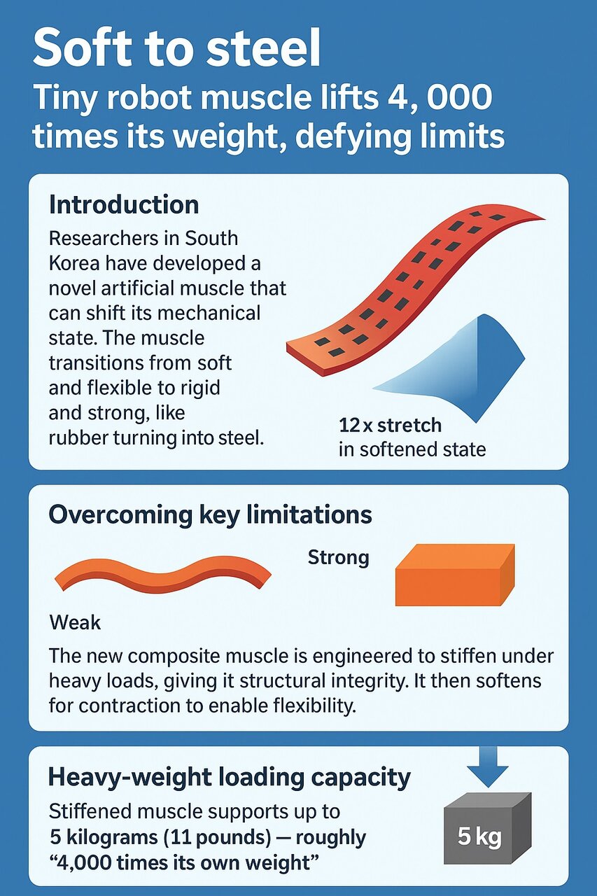 حالا تیم پروفسور "هون اوی" با ساخت عضلهای به وزن تنها ۱.۲۵ گرم موفق شده تا این مانع را از پیش رو بردارد. طراحی این عضله ترکیبی به نحوی است که هنگام تحمل بار، سفت شده و استحکام ساختاری پیدا میکند و در هنگام انقباض، نرم میشود تا انعطاف لازم را داشته باشد.