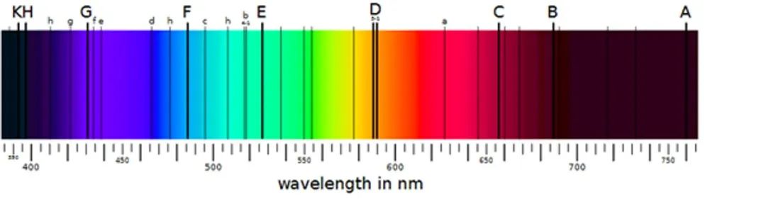 طیف خورشید با خطوط تیره، نشاندهنده جذب نور توسط عناصر در طولموجهای مخصوصشان است.