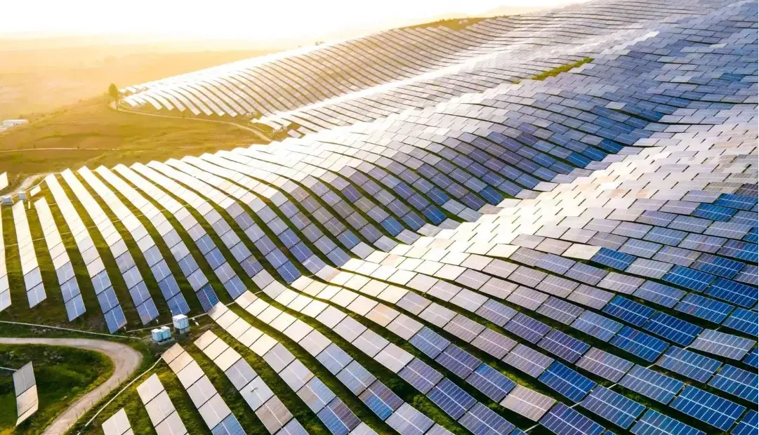 نمای هوایی از یک مزرعه کشاورزی-خورشیدی (ترکیب تولید برق خورشیدی و کشاورزی) در شهر ههچی، چین، در تاریخ ۲۵ اکتبر ۲۰۲۵.