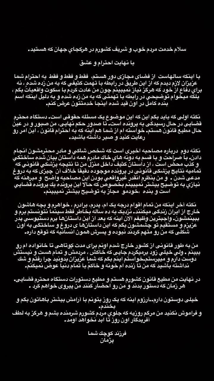 آخرین خبر/ پژمان جمشیدی در واکنش به مصاحبه جنجالی مادر شاکی نوشت: قسم به دونه های خاک مادرم، داستانهای کثیف پخش شده ساختگی و کذب است