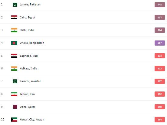 پس از آن نیز شهر قاهره در مصر با شاخص ۴۳۷ در جایگاه دومِ رتبهبندی جهانی کیفیت هوا قرار گرفت.