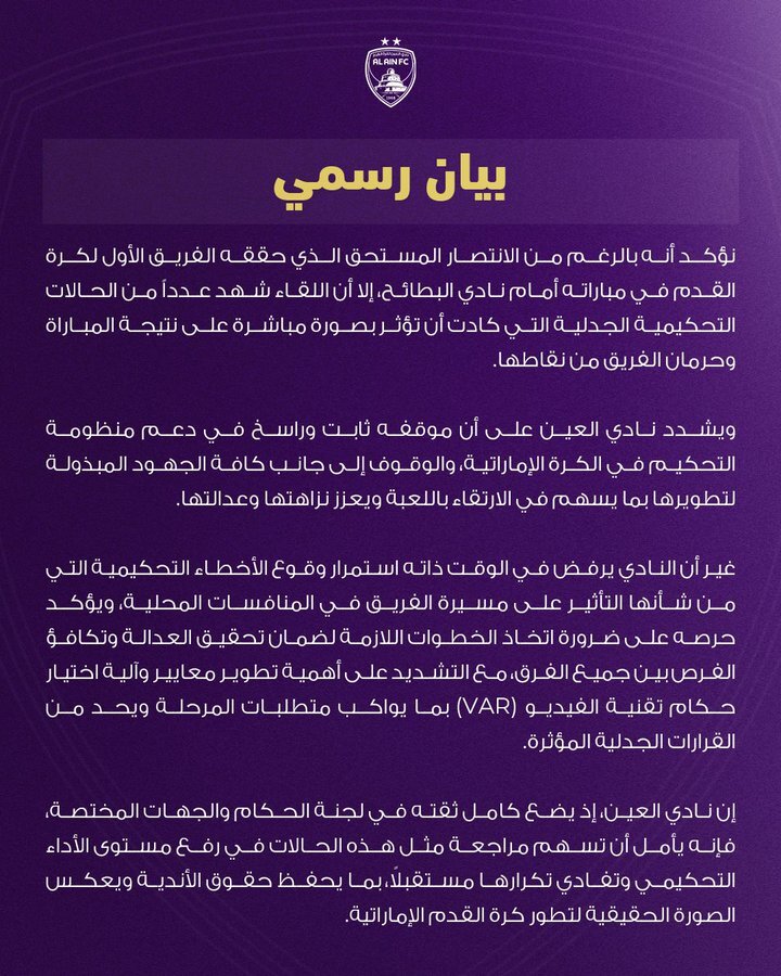با این حال، باشگاه العین ادامه اشتباهات داوری که میتواند بر مسیر تیم در رقابتهای داخلی اثرگذار باشد را نمیپذیرد و بر ضرورت برداشتن گامهای جدی برای تضمین عدالت و برابری فرصتها میان همه تیمها تأکید میورزد. همچنین خواستار ارتقای معیارها و مکانیزم انتخاب داوران VAR متناسب با نیازهای روز است تا از بروز تصمیمات بحثبرانگیز و اثرگذار جلوگیری شود.