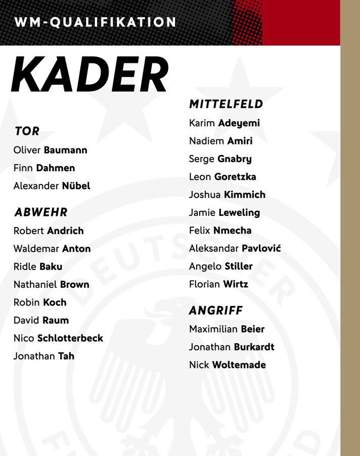 فلیکس انمچا، نیکو شلوتربک، یوناتان بورکاردت و الکساندر پاولوویچ نیز بار دیگر به کادر تیم ملی بازگشته‌اند. ریدله باکو نیز پس از مدت‌ها به تیم ملی دعوت شده است. این بازیکن 27 ساله آخرین بار در نوامبر 2021 برای آلمان به میدان رفته بود.