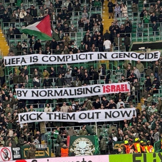 در تازه‌ترین مورد، هواداران تیم فوتبال سلتیک که در زمینه حمایت از فلسطینی‌ها سابقه طولانی دارند و در اروپا پیشتاز هستند، در جریان شکست خانگی 2 بر صفر شب گذشته (پنجشنبه) تیم محبوب‌شان مقابل براگای پرتغال در هفته دوم رقابت‌های فصل جدید لیگ اروپا، بنرهایی با خود به ورزشگاه سلتیک پارک آورده بودند که روی آن نوشته شده بود: «یوفا با عادی‌سازی اسرائیل، در نسل‌کشی همدست است. همین حالا آنها را اخراج کنید!».
