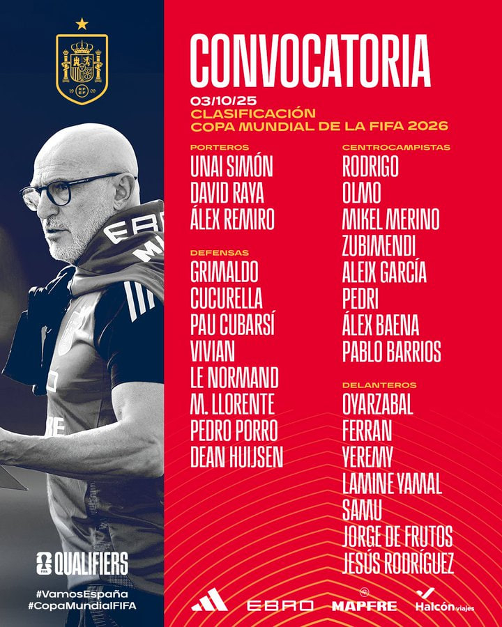 لوئیس دلافوئنته لیست بازیکنان را برای بازی‌های مقدماتی بعدی مقابل بلغارستان و گرجستان در هفته‌های سوم و چهارم مرحله مقدماتی جام جهانی 2026 که تابستان آینده در ایالات متحده، مکزیک و کانادا برگزار می‌شود، اعلام کرد. این لیست تغییرات عمده‌ای به جز غیبت کارواخال، نیکو ویلیامز، فرمین، فابیان رویز و گاوی به دلیل مصدومیت ندارد که این موضوع امکان حضور باریوس، مارکوس یورنته، سامو و فران تورس را فراهم کرده است.