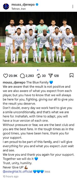 ایرنا/موسی جنپو بازیکن تیم فوتبال استقلال تهران با انتشار پیامی احساسی در صفحه شخصی خود از هواداران این تیم عذرخواهی کرد و وعده داد که آبیپوشان به روزهای خوب بازخواهند گشت.