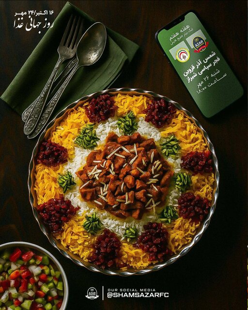 تیم‌های شمس آذر قزوین و فجر سپاسی ساعت ۱۸ روز شنبه ـ ۲۶ مهر ماه ـ به مصاف هم می روند که در همین راستا، تبریک قابل جالب باشگاه شمس‌آذر به مناسبت روز جهانی غذا با تصویری از قیمه نثار قزوینی را در پوستر این تیم شاهد هستیم.