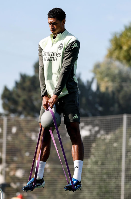 تنها ۲۴ ساعت پس از سوت پایان دیدار در ریگا بود که بلینگام در تمرینات رئال مادرید به‌ شدت مشغول کار و تلاش دیده شد، تمرینی متفاوت که با تصویری حیرت‌انگیز از او در میانه هوا توجه هواداران سراسر جهان را به خود جلب کرد. عکسی که در حساب رسمی اینستاگرام رئال مادرید منتشر شد و بیش از ۷۵۰ هزار لایک گرفت، این بازیکن را «در حال پرواز» نشان می‌داد، در حالی که وزنه‌ای از نوع کتل‌بل در دست داشت و کش‌های مقاومتی به کف کفش‌هایش بسته شده بودند.