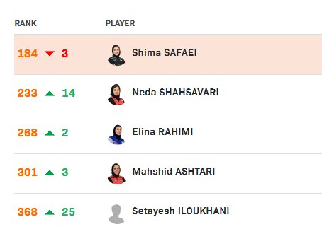 در بخش دختران تنها شیما صفایی سه پله تنزل جایگاه داشت و بقیه دختران صعود کردند.