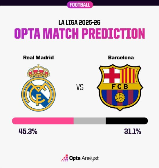 به گفته سوپرکامپیوتر Opta، احتمال برد رئال مادرید در این دیدار ۴۵ درصد و احتمال برد بارسلونا ۳۱ درصد است. فصل گذشته، تیم سفیدپوش همه دیدارها را به بارسا واگذار کرده بود.