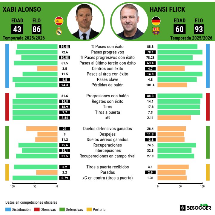 بر اساس دادههای BeSoccer، تیم ژابی آلونسو در شاخصهایی مانند پاس، بازپسگیری توپ، دریبل و شوت برتری دارد، در حالی که تیم فلیک در پاسهای رو به جلو، دفع توپ، نبردهای هوایی و عملکرد دروازهبان بهتر است. در نتیجه، از نظر تئوریک، برتری اولیه با رئال مادرید است.