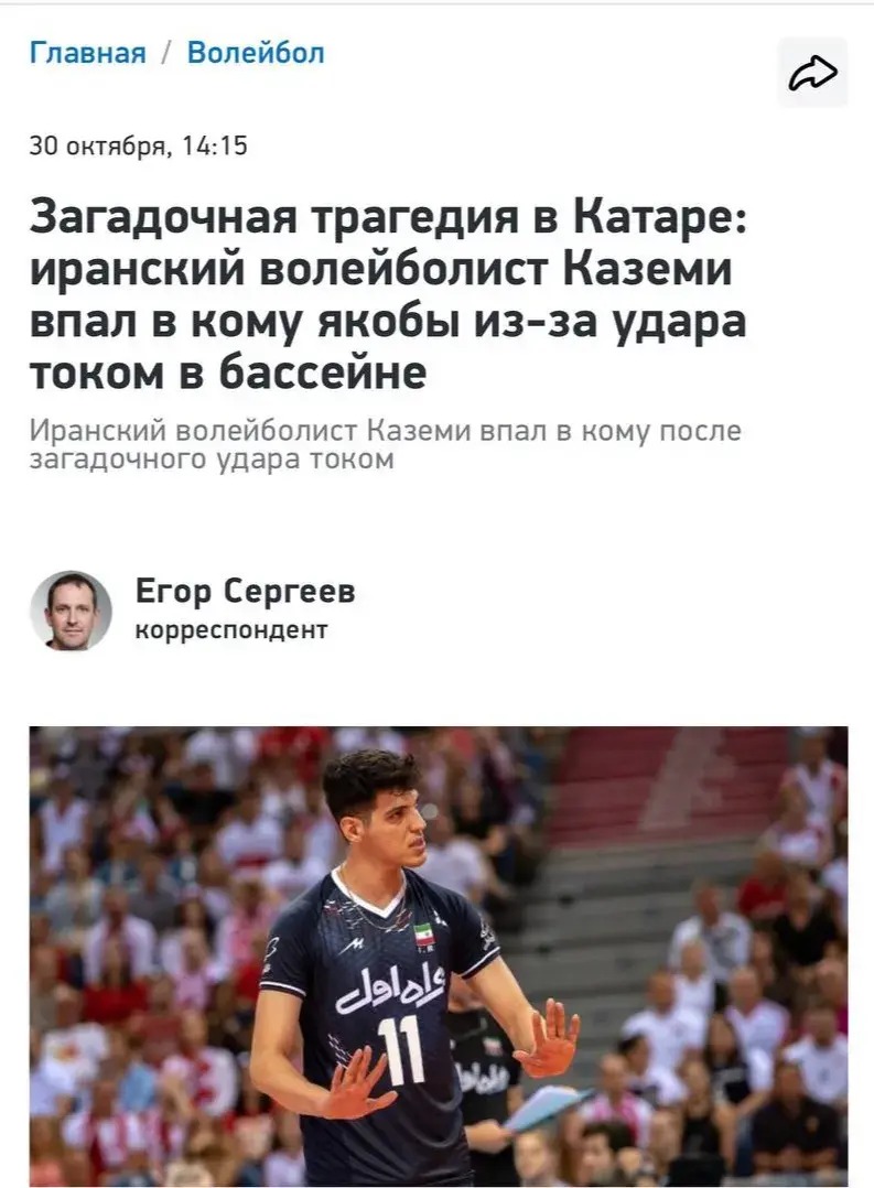 ورزش 3/فدراسیون والیبال ایران اعلام کرد که صابر کاظمی، ستاره ۲۶ ساله والیبال ایران و بازیکن باشگاه الریان قطر، دچار مرگ مغزی شده است؛ حادثهای مبهم که در استخر محل اقامت تیمش در دوحه رخ داد و هنوز جزئیات آن بهطور کامل مشخص نشده است.