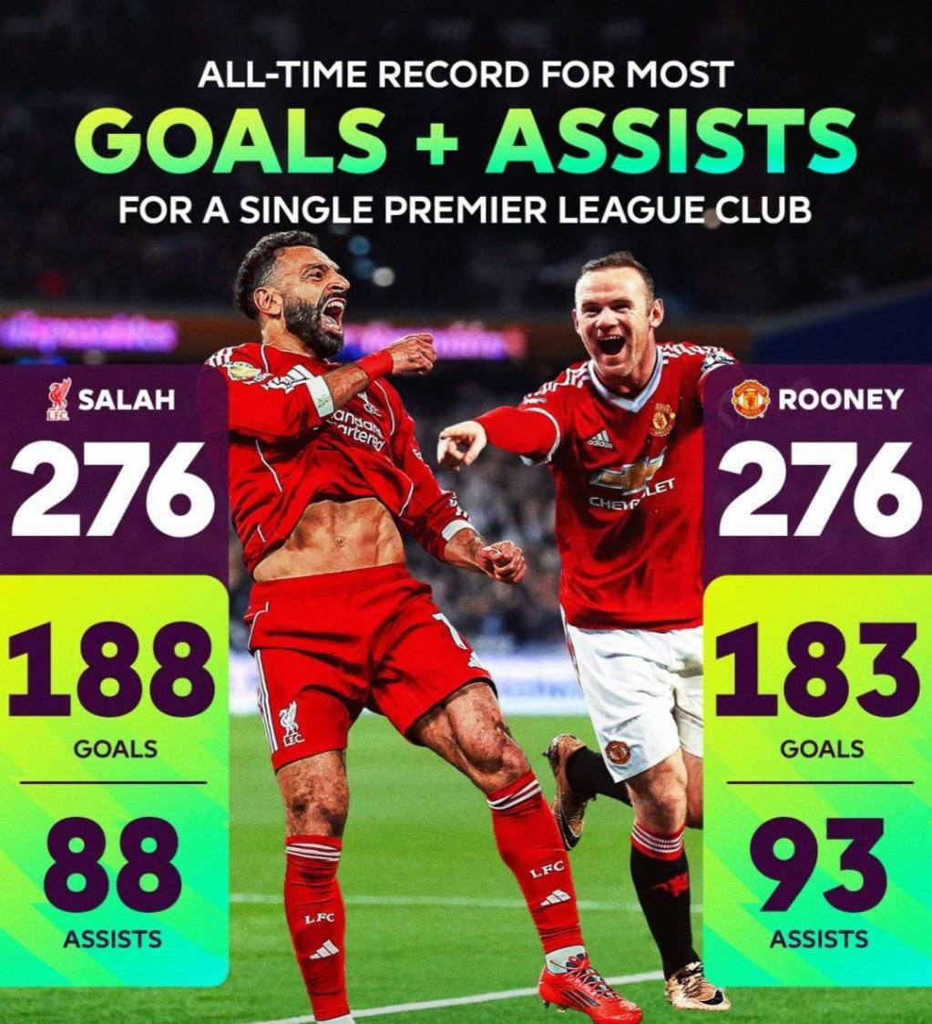 با احتساب گل صلاح مقابل ویلا، فرعون مصری اکنون با ۱۸۸ گل و ۸۸ پاسگل با پیراهن لیورپول در تاریخ لیگ برتر انگلیس، به همراه وین رونی با مجموع ۲۷۶ تاثیرگذاری روی گل، رکورد بیشترین تاثیرگذاری در گلهای تاریخ لیگ جزیره با پیراهن یک باشگاه خاص (لیورپول) را در اختیار دارد. رکوردی جاودان برای ستاره مصری قرمزهای آنفیلد که تا میتواند تا سالهای سال دست نخورده بماند.