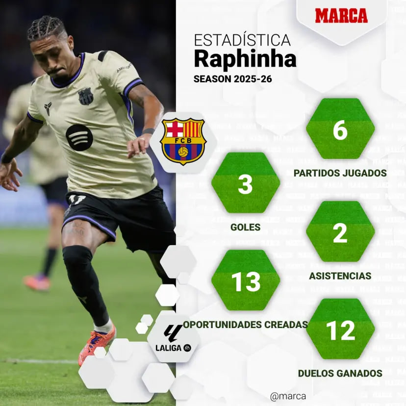 با این حال، یک عامل دیگر نیز وجود دارد که از نگاه بسیاری پنهان مانده اما با توجه به نتایج، انکارناپذیر است: بارسلونا به شدت جای خالی رافینیا را احساس می‌کند. همیشه درباره نقش مهم لامین یامال و پدری در تیم صحبت می‌شود اما واقعیت این است که این بازیکن برزیلی اصلی‌ترین تهدید تهاجمی بارسا است. کارنامه هفت مسابقه‌ای که فلیک توانسته از او استفاده کند، خودش گویای همه چیز است: بارسلونا در این هفت بازی، شش پیروزی و یک تساوی به دست آورده و ۲۱ گل زده و تنها پنج گل دریافت کرده است.