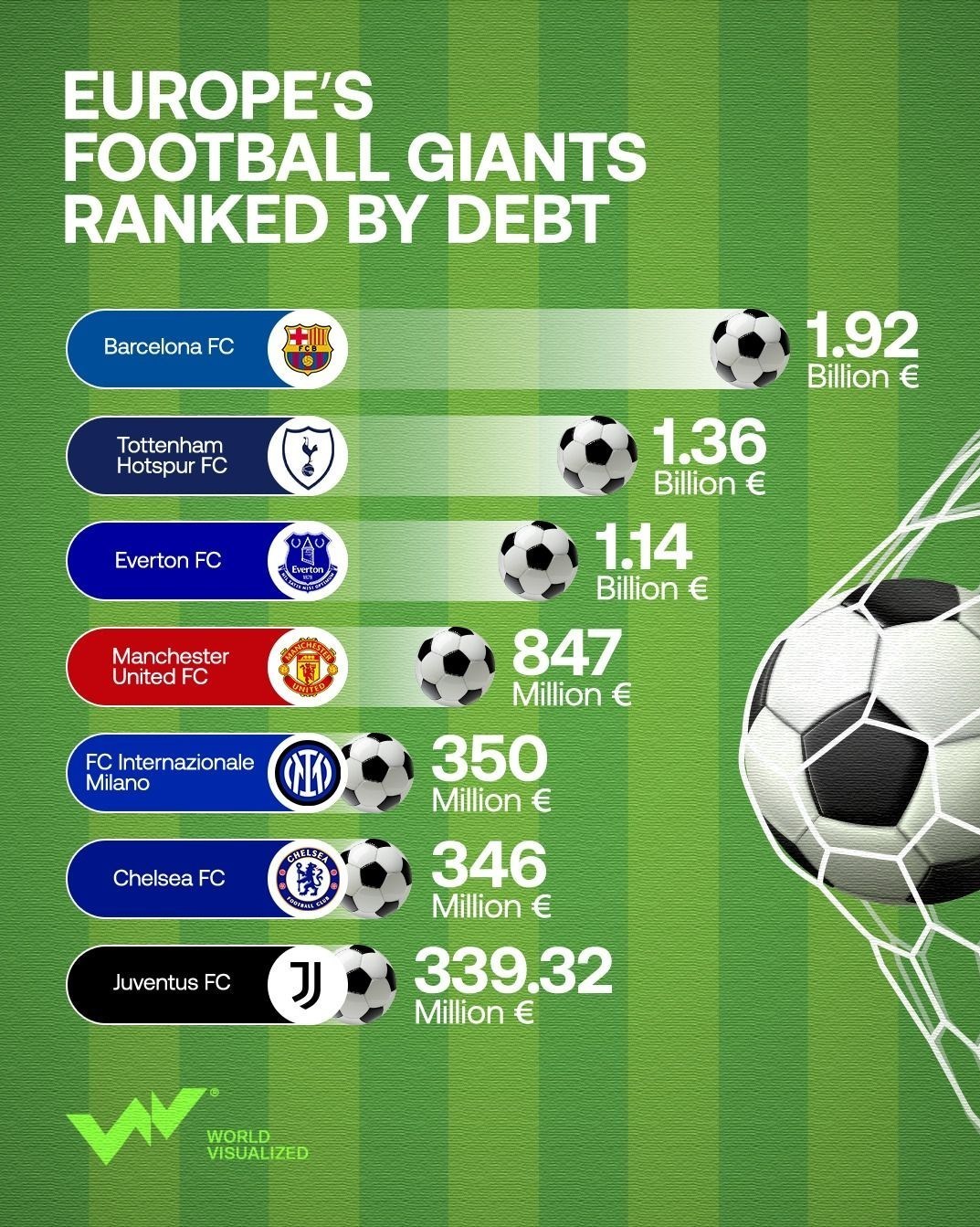 تیمهای لیگ برتر انگلیس با وجود کسب بیشترین درآمد به واسطه فروش حق پخش تلویزیونی، به همین نسبت بالاترین بدهیها را نیز به ثبت رساندهاند و وجود یکی دیگر از نمایندگان آنها، منچستریونایتد در رتبه چهارم گواه این موضوع است. بدهی فعلی شیاطین سرخ 847 میلیون یورو اعلام شده است. علاوه بر آنها چلسی نیز با بدهی 346 میلیون یوریوییاش درجایگاه ششم ایستاده است. میان این دو تیم انگلیس، اینتر ایتالیا با بدهی 350 میلیون یوروییاش رتبه پنجم را در اختیار دارد. هفتمین و آخرین جایگاه ثبت شده در این ردهبندی نیز متعلق به یوونتوس است که 339.32 میلیون یورو بدهی دارد.