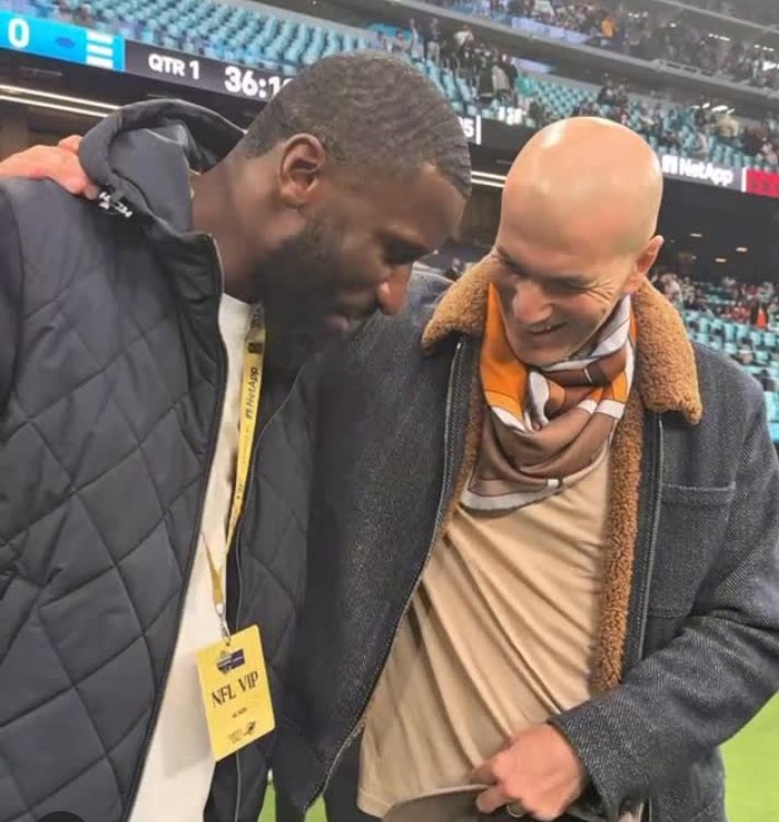 ورزش 3/بازی تاریخی روز یکشنبه اِناِفاِل بین میامی دلفینز و واشنگتن کامندرز در ورزشگاه سانتیاگو برنابئو، تصاویر چشمگیر زیادی را به همراه داشت، از جمله لحظه گرمی که بین آنتونیو رودیگر، مدافع میانی رئال مادرید، و زینالدین زیدان، اسطوره باشگاه مادریدی، به اشتراک گذاشته شد.