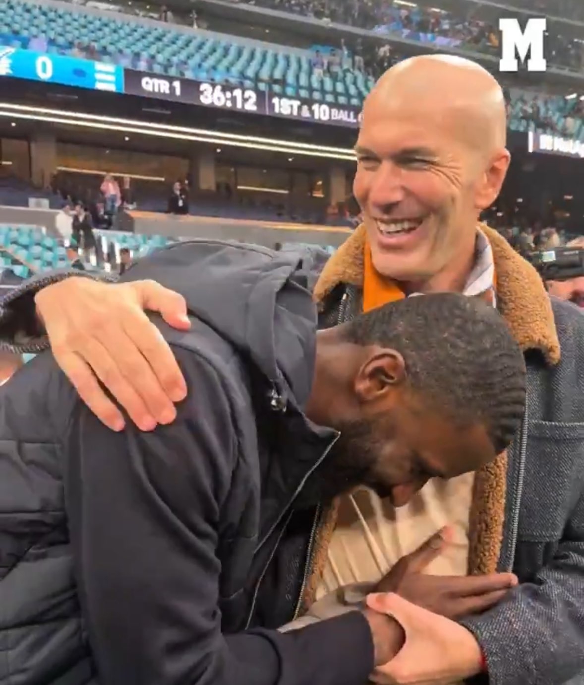 دوربینهای دازن هر دو را در حال دست دادن و در آغوش گرفتن یکدیگر ثبت کردند که تشویق هواداران حاضر در سکوهای ورزشگاه را به همراه داشت. مدافع آلمانی، که در مراحل پایانی بهبودی از مصدومیت سپتامبر گذشته خود قرار دارد، به نظر میرسید به زیدان مورد تحسینش میگفت که حالش بهتر است و برای بازگشت در بازی بعدی لیگ، که رئال مادرید به مصاف الچه میرود، آماده خواهد بود.